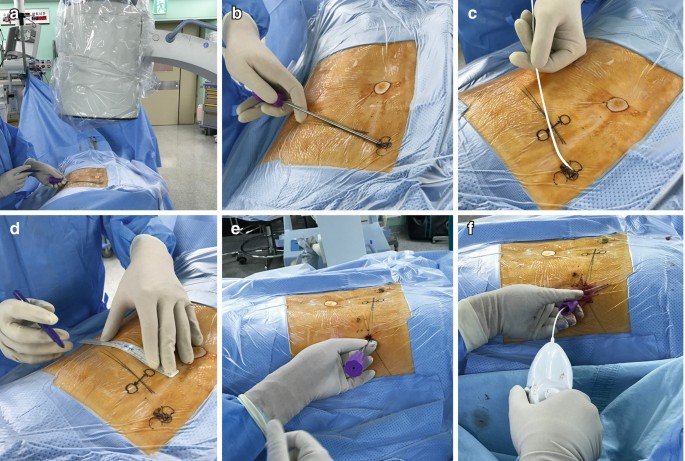 • Under local anesthesia and fluoroscopic (X-ray) guidance, a catheter is inserted through the skin into the epidural space. The physician uses the catheter to inject saline solution, anti-inflammatory medications, and sometimes enzymes to break up scar tissue.
